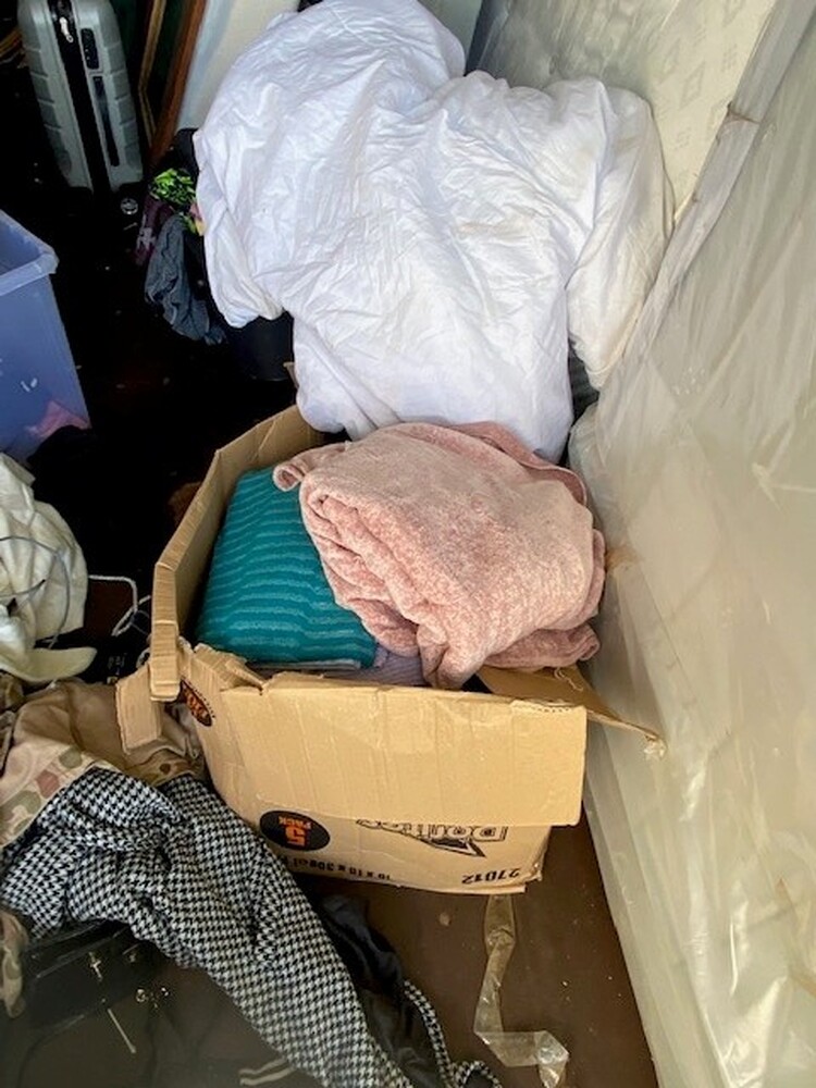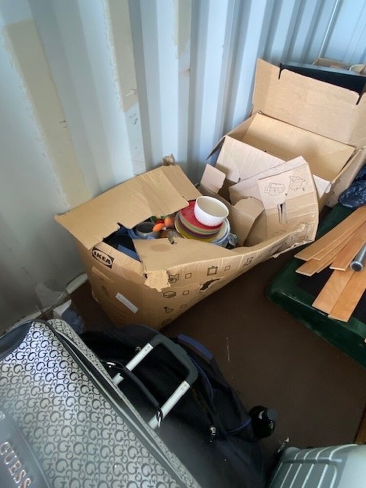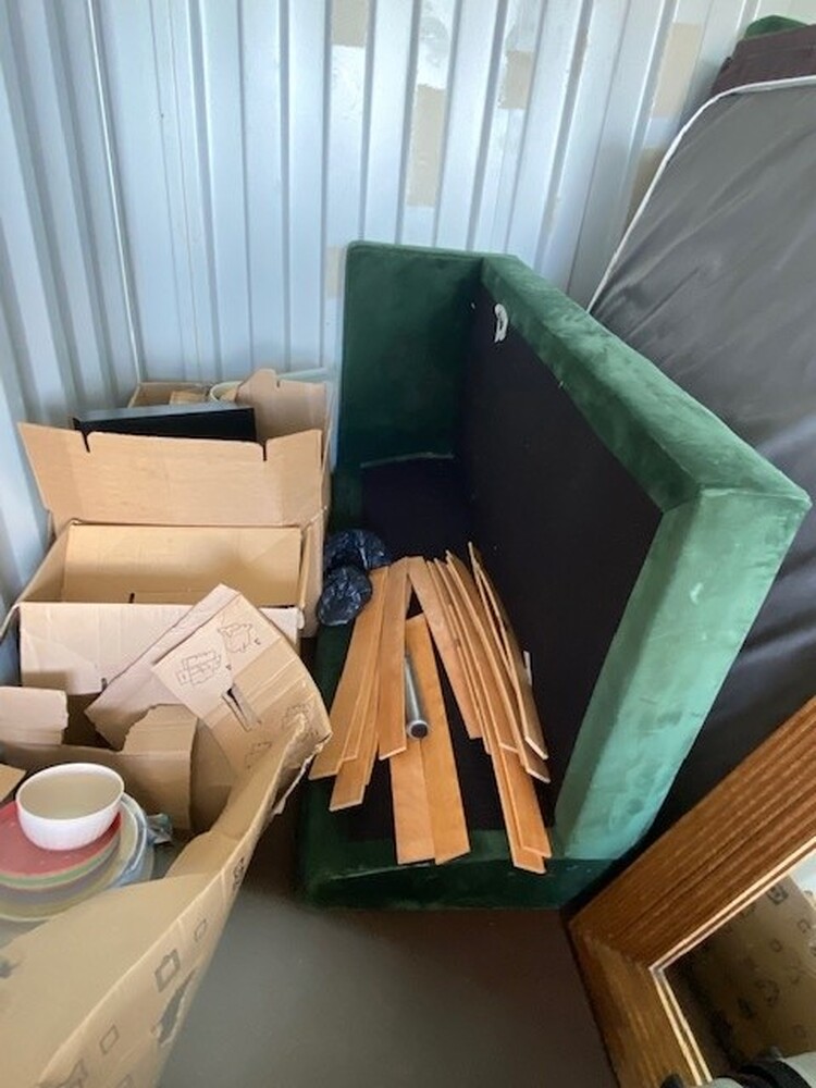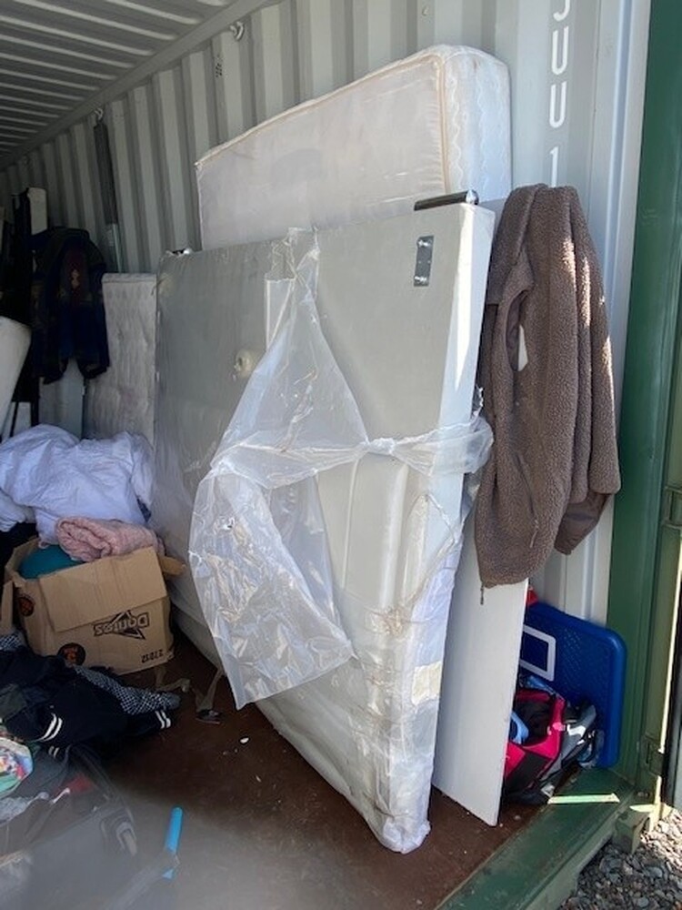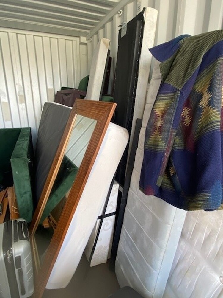 The container appears to contain a range of household items including clothes, towels, mattress, mirror and kitchen items.