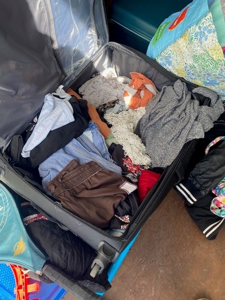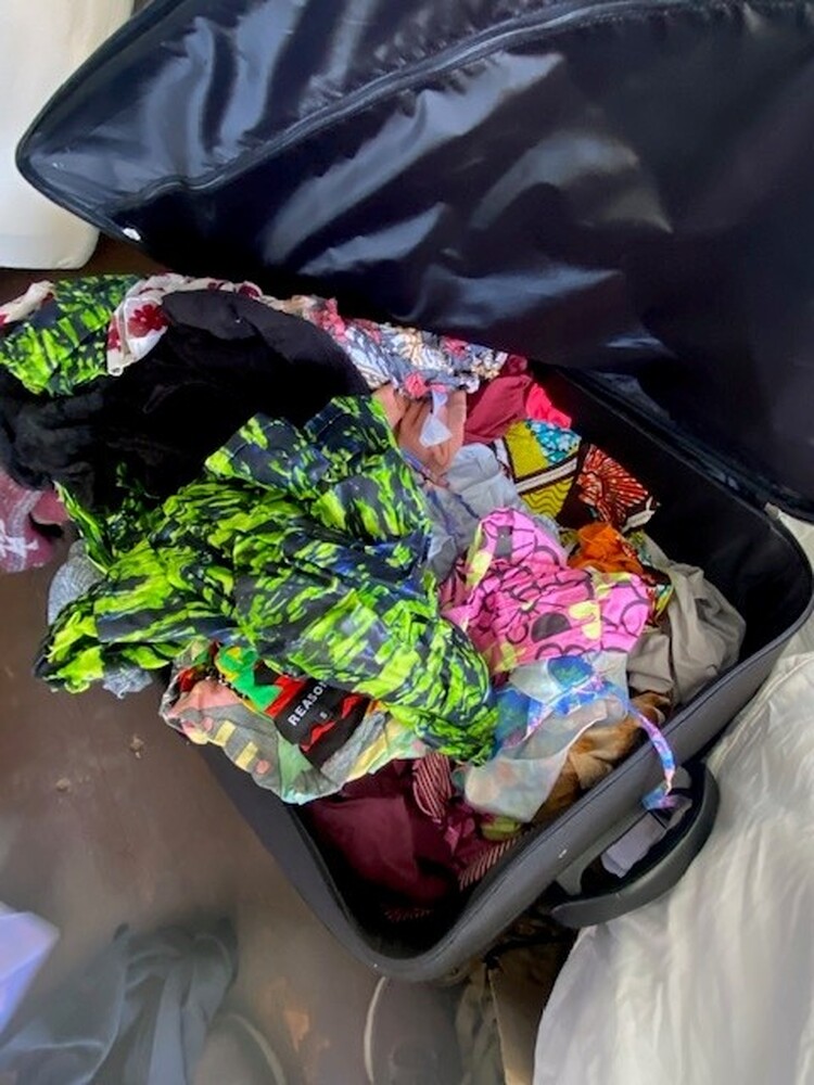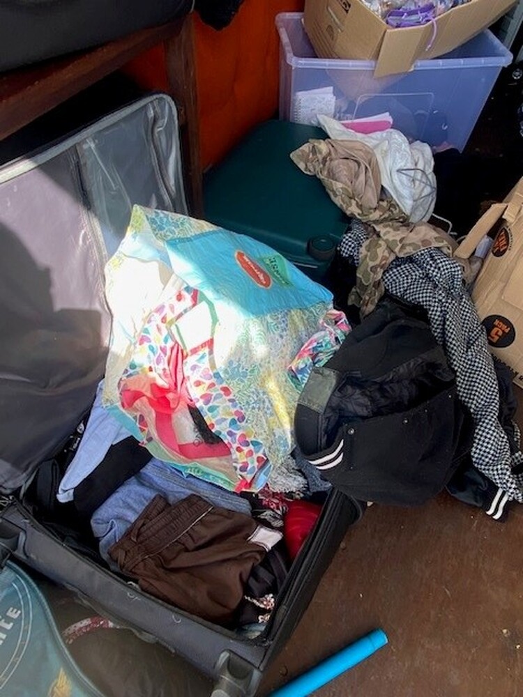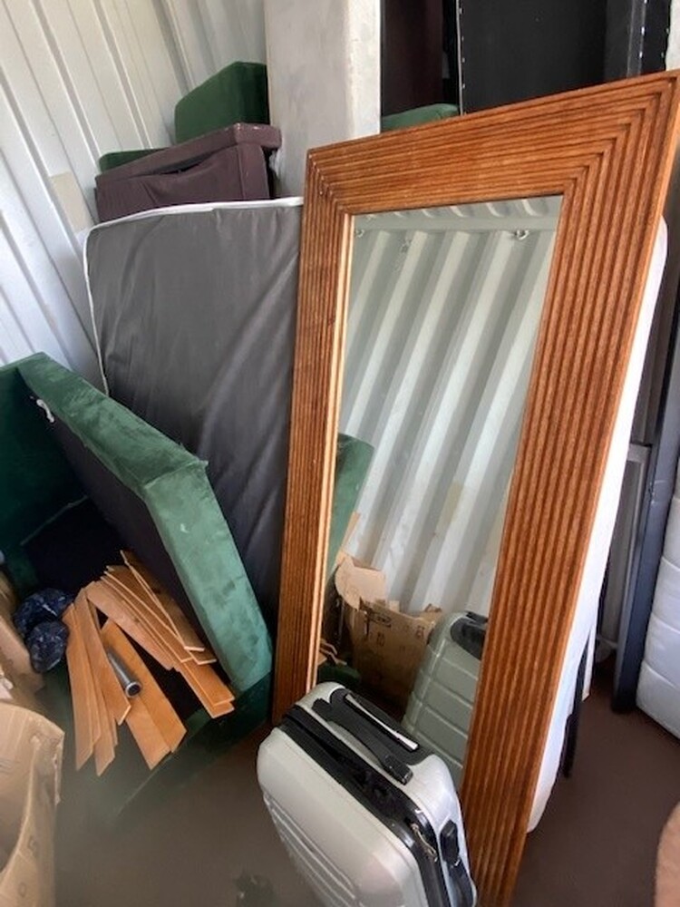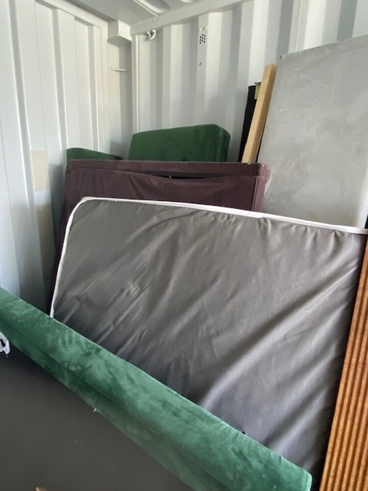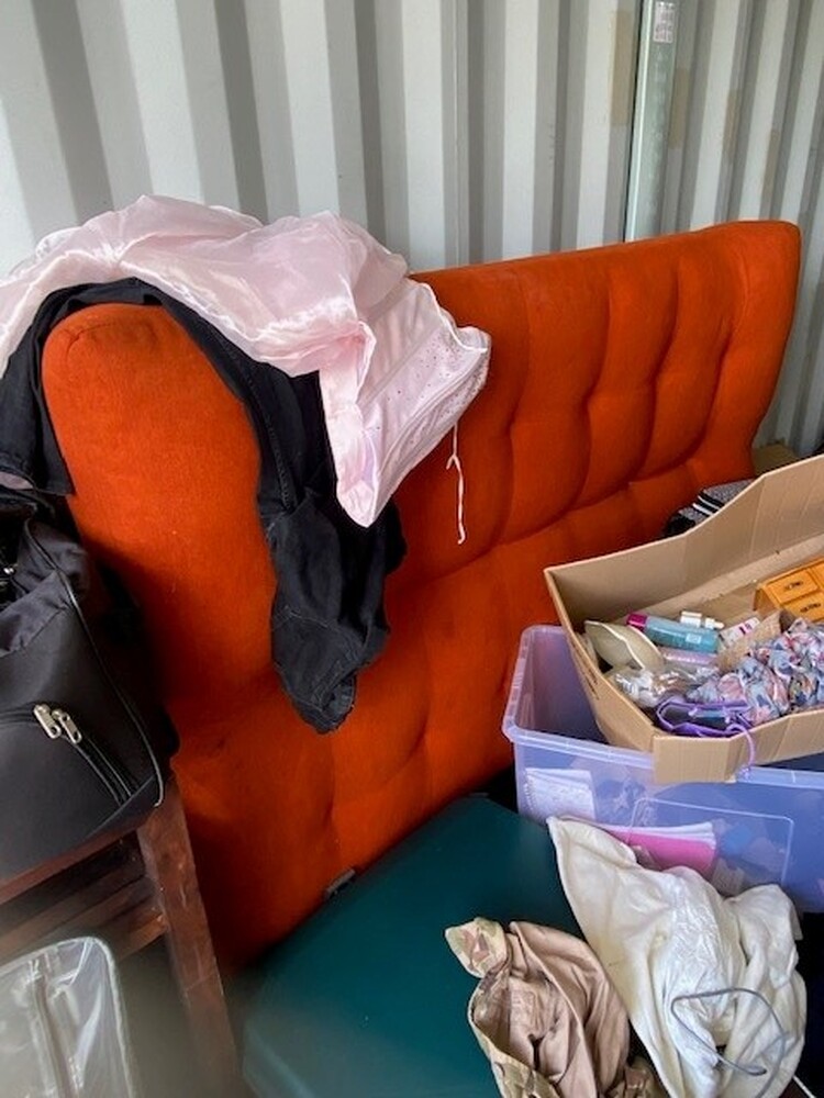 The container appears to contain a range of household items including clothes, towels, mattress, mirror and kitchen items.