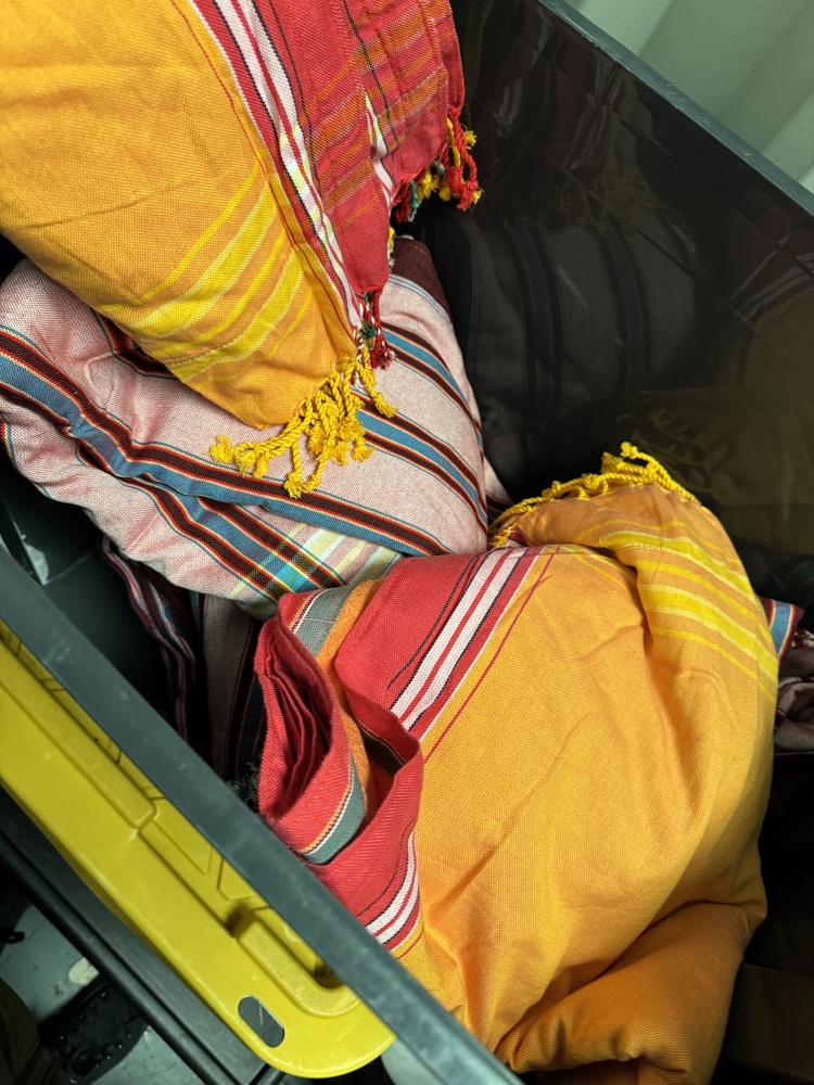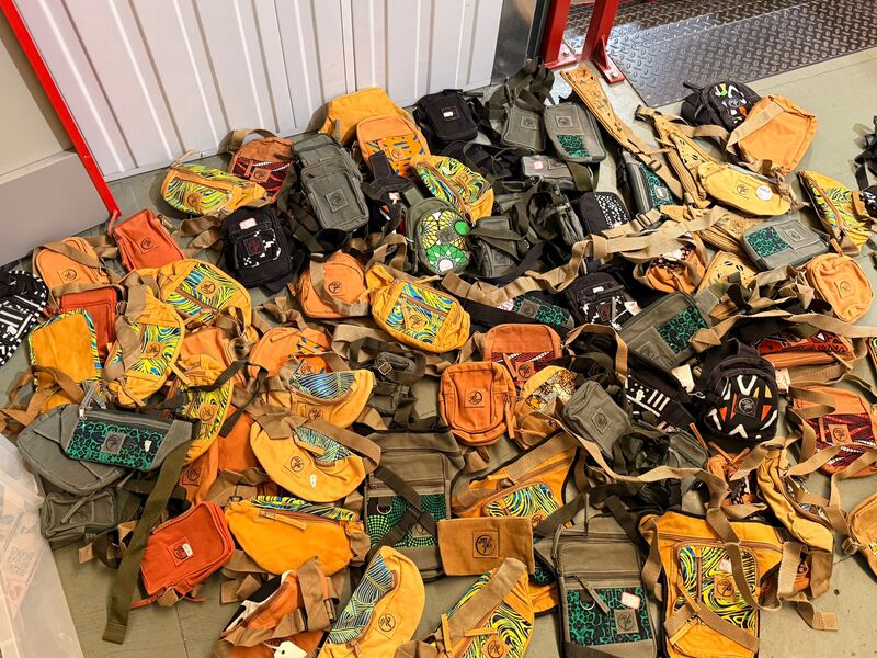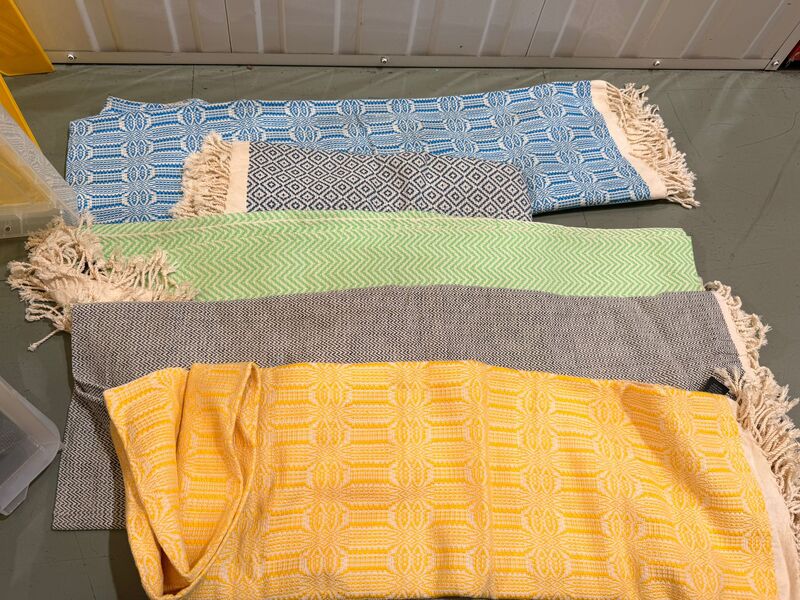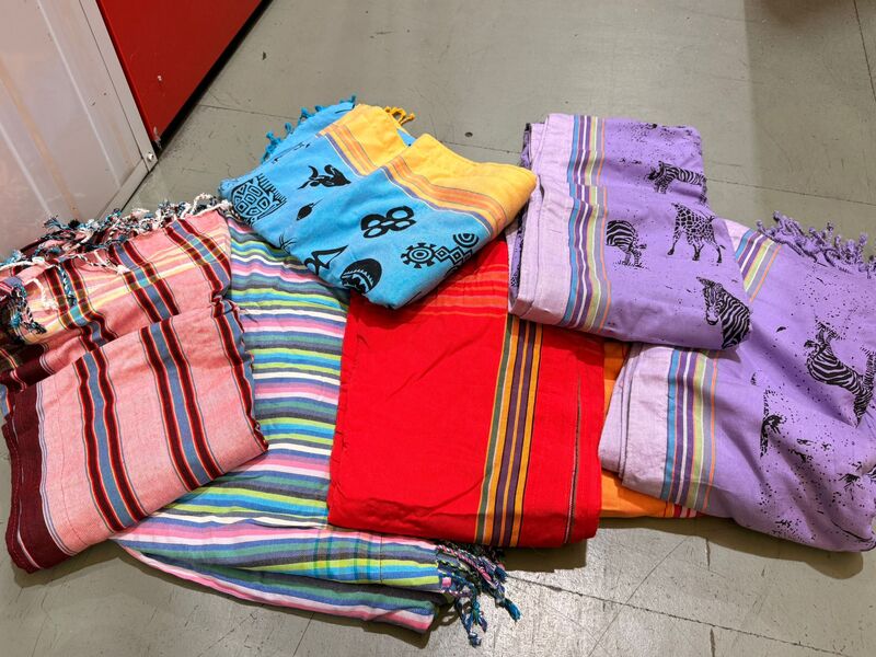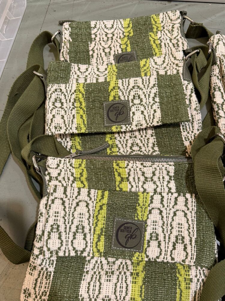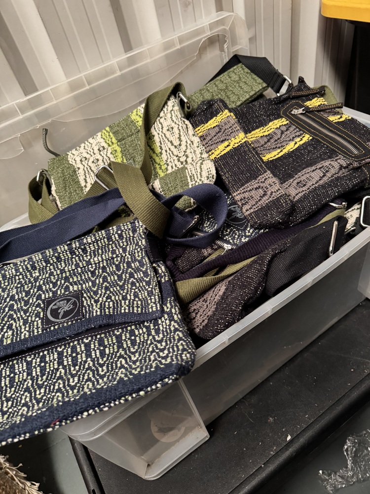 Satchels, backpacks, messenger bags, purses, coin purses, card holders, handbags, textiles, scarves, trousers, cover ups, beach robes, rugs, place settings,