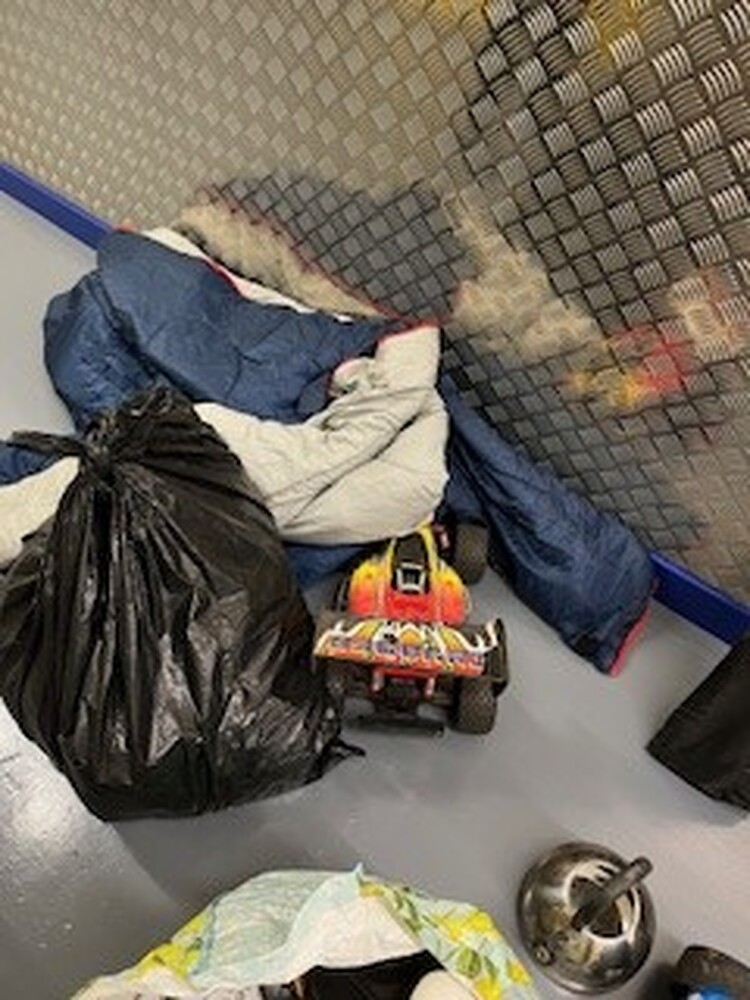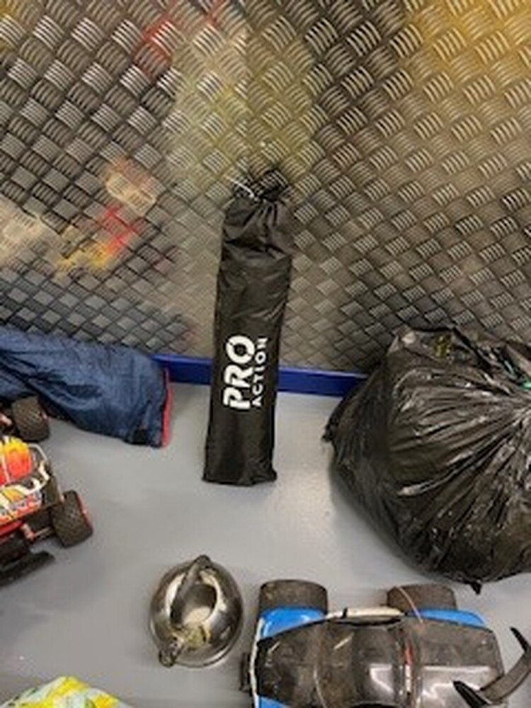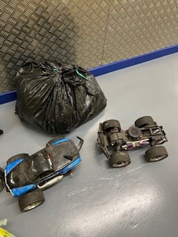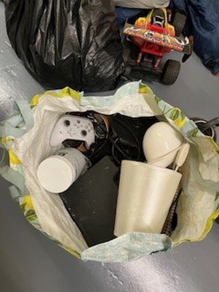 The unit also includes various remote control cars, a bag of household items including an Xbox controller, a side table lamp and kettle.