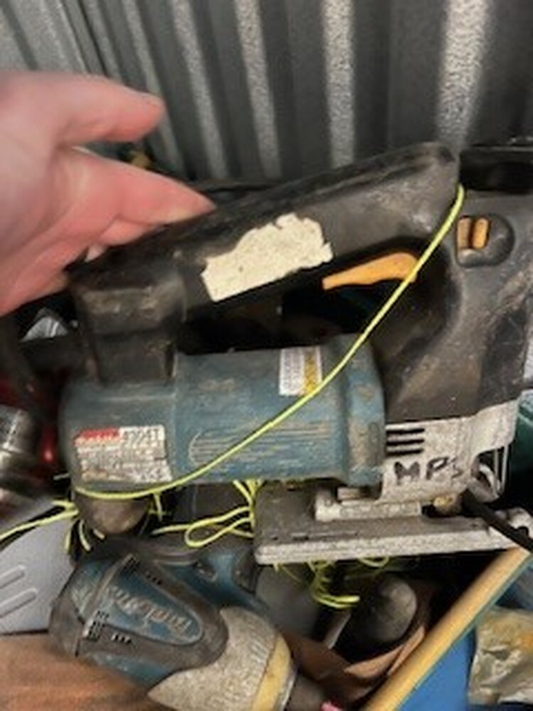 This 10 sqft unit contains a mix of assorted items including power tools and household goods. Features a cordless Makita drill, Makita jigsaw, and a selection of additional tools in a box. Also includes Nike mid-top trainers, foldable camping chair, Pro Action tent, sleeping bag, and a high-vis thermal jacket.