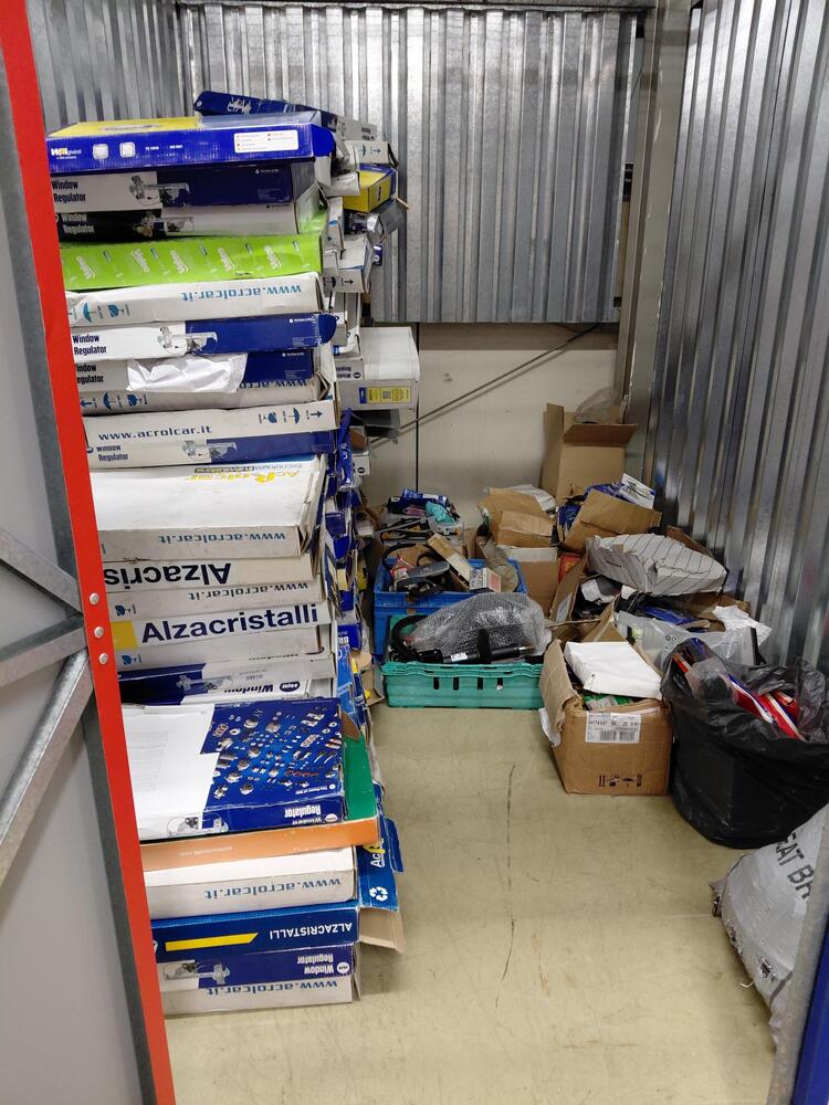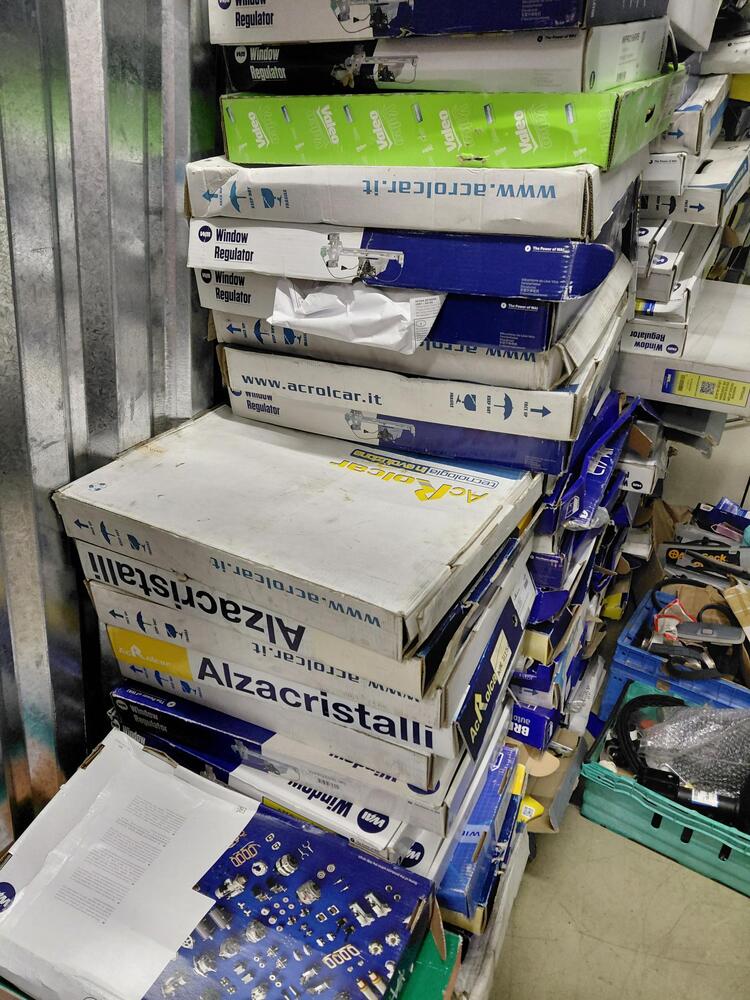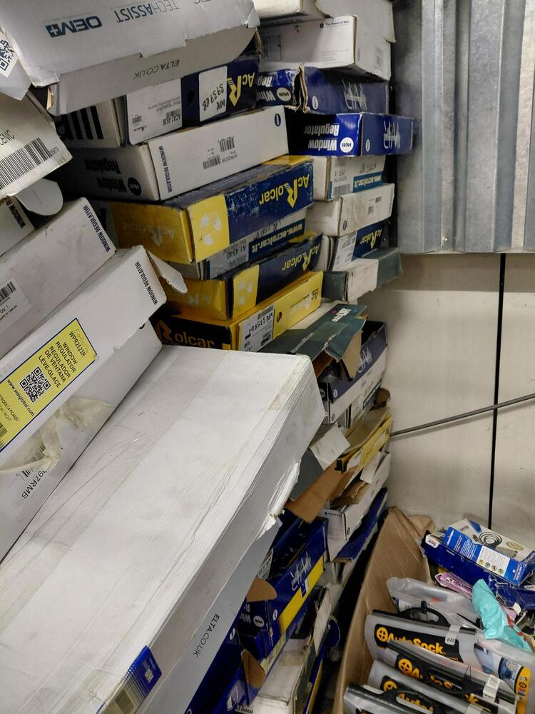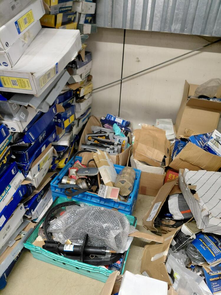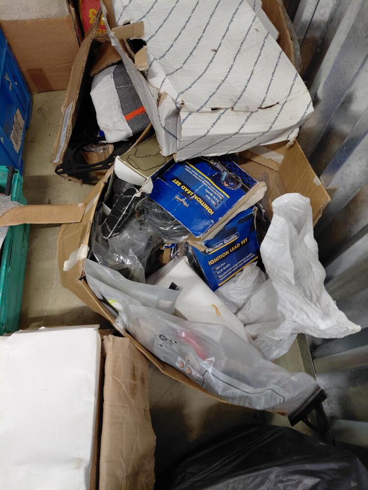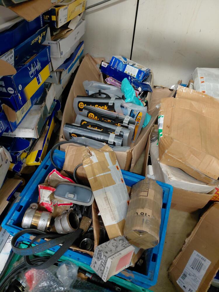 multiple boxes and crates of car parts such as drive belts, ignition leads, electric window regulators among others