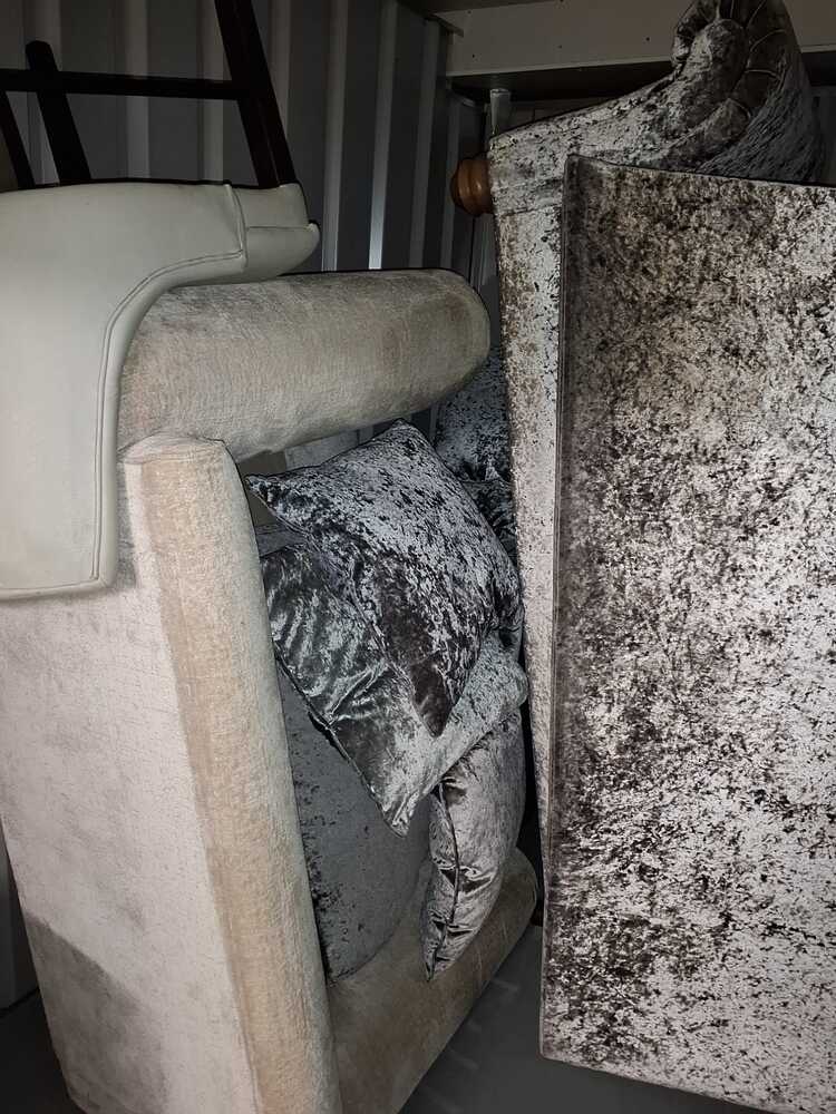 IMPORTANT: Please note that iBidOnStorage will process a 10-Day HOLD on your debit/credit card as the auction closes. Bank Card cleaning deposits are a temporary hold against the funds of your credit or debit card and the funds will be available again within 10 days. We will only charge your bank card if all the contents from the unit are not cleared. PLEASE NOTE YOU HAVE 7 DAYS FOR COLLECTION OF THE GOODS. For return of the £100 Cleaning Deposit: room must be cleared in full and left unlocked with lock and keys placed on the floor inside the unitCRUSHED VELVET SOFA, SOFA, CHAIRS, CUSHIONS