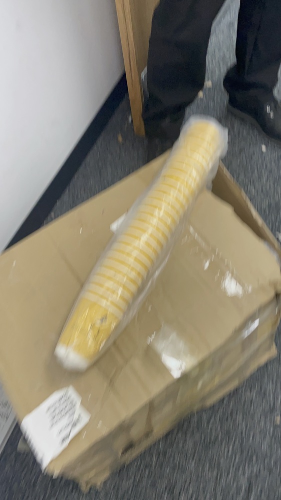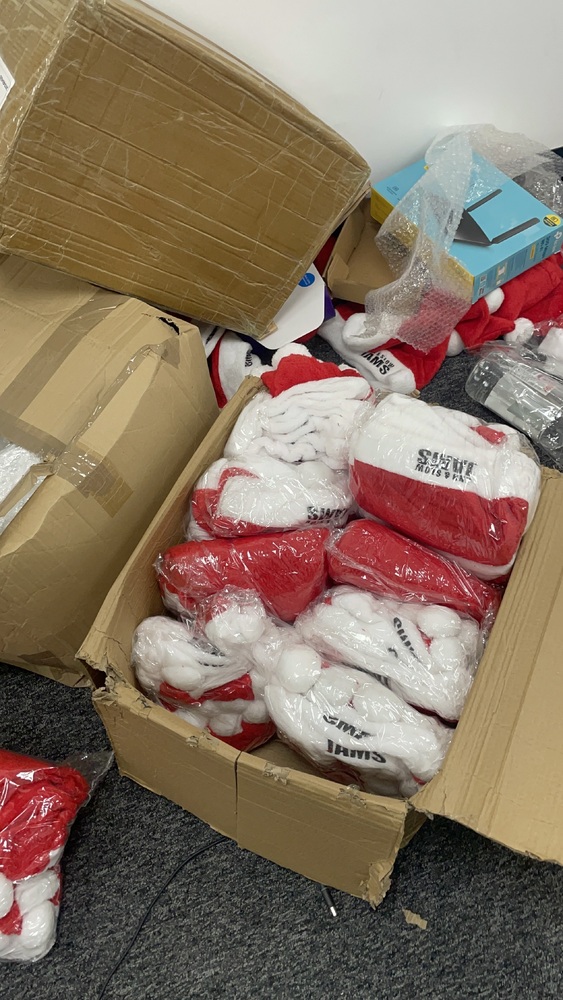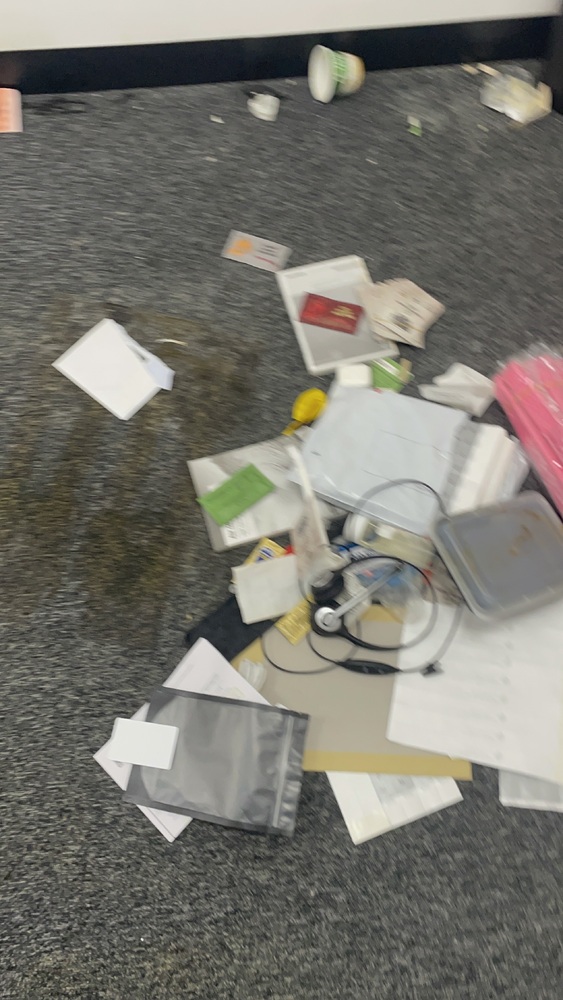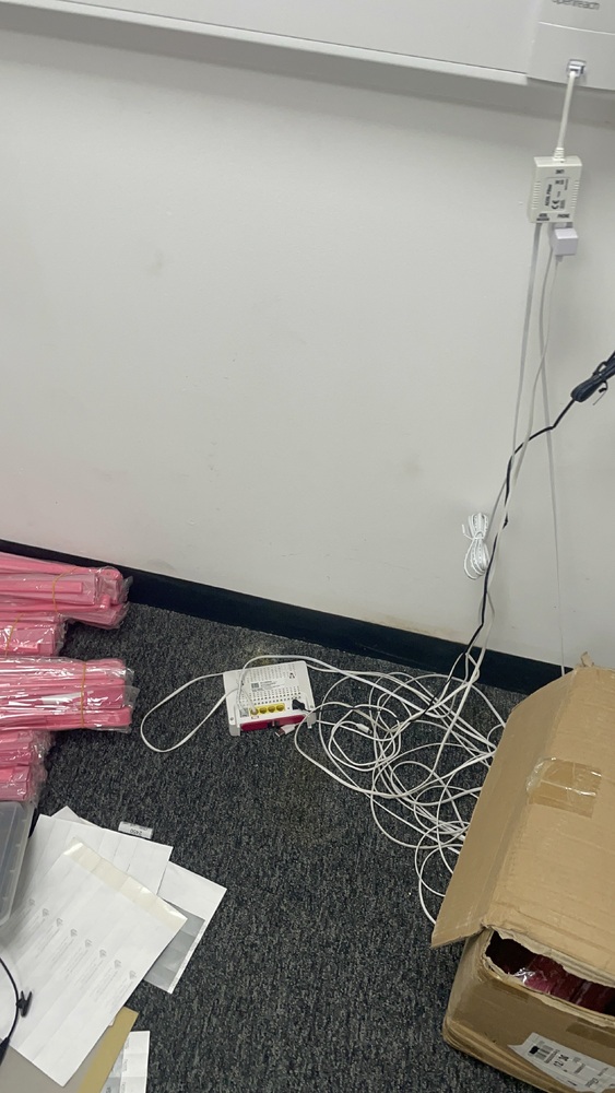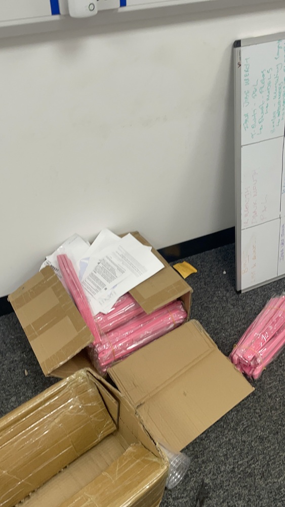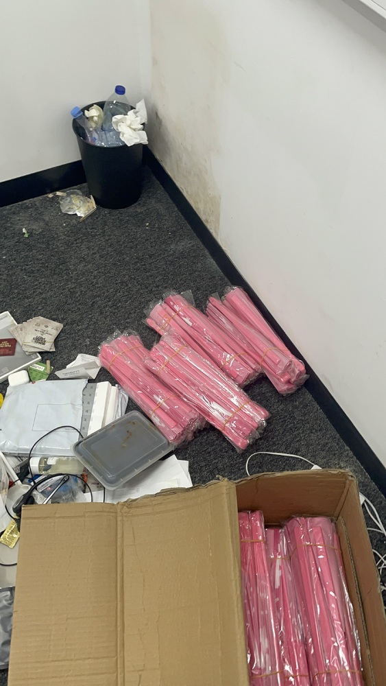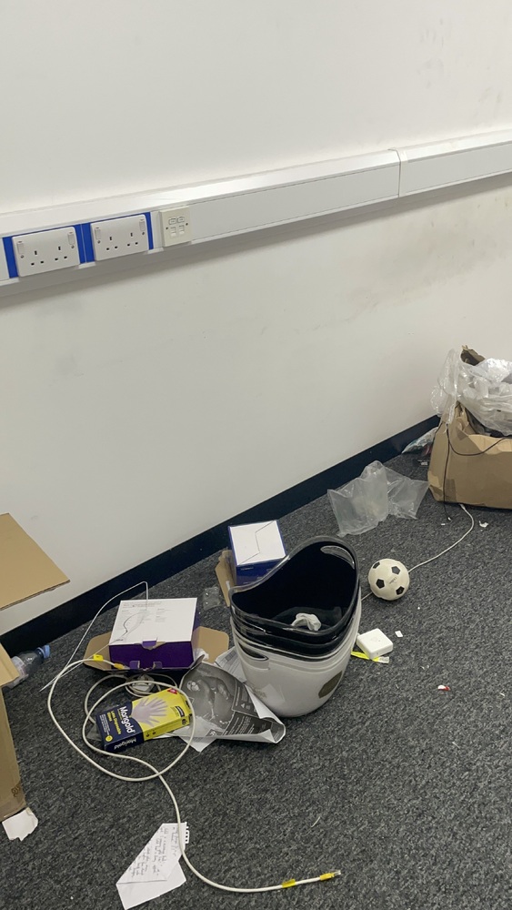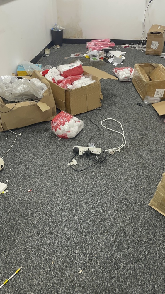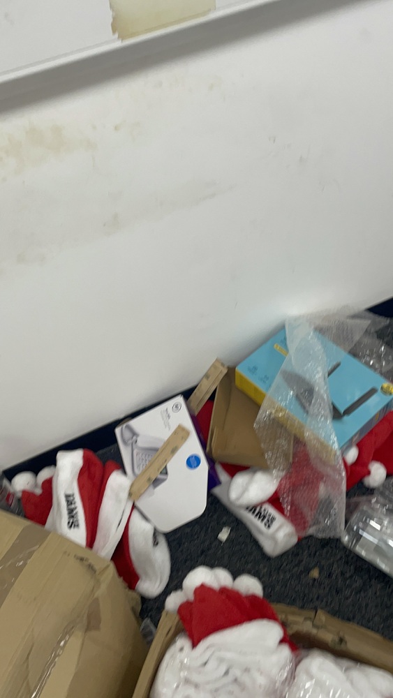 Verse 150 ft.² office had a box of branded Christmas hats two boxes of branded folded up fans one box of brand of coffee cups mixture of cables, routers other stationary other unknown items in one whiteboard