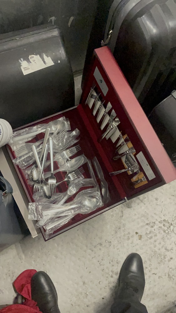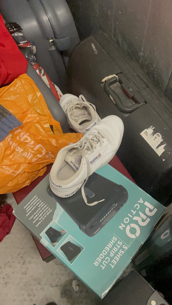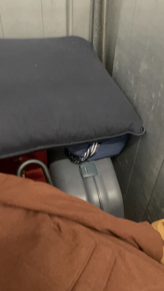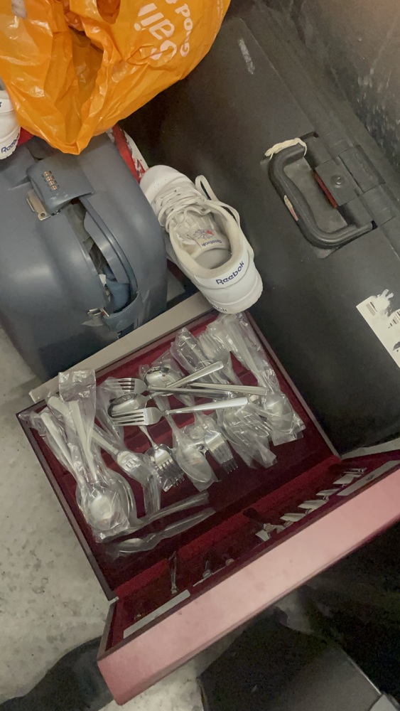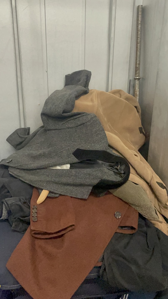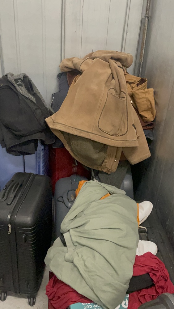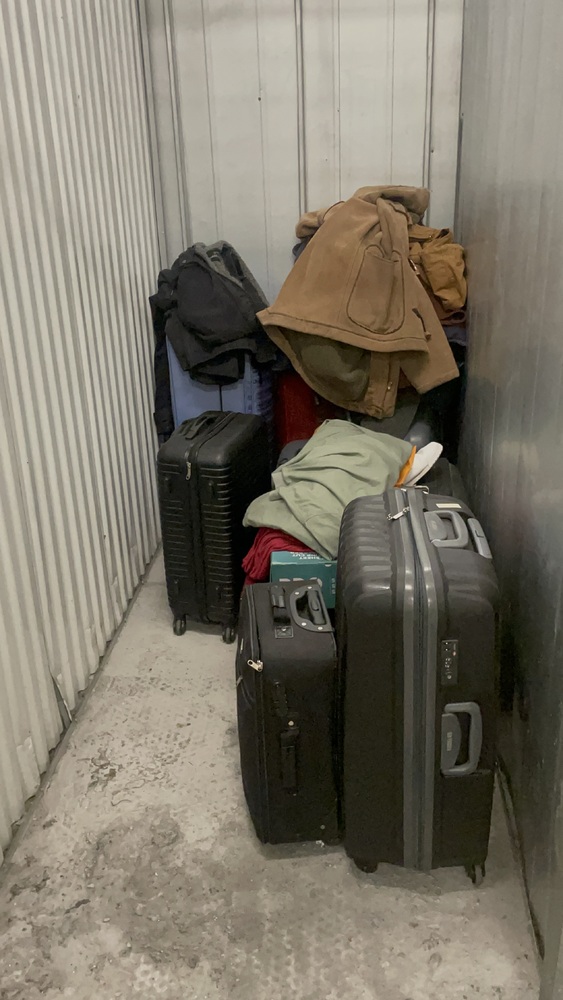 This 25 ft.² unit had nine suitcases with unknown personal effects one smart wooden cutlery box box that might have a shredder in it multiple jackets and other personal items