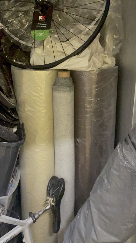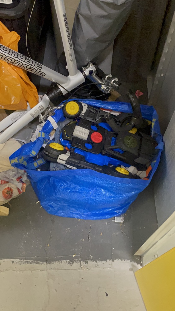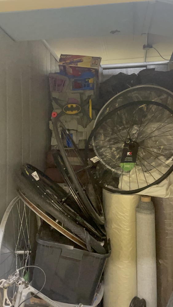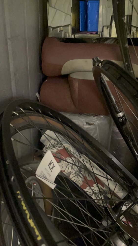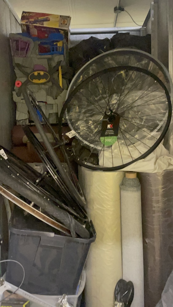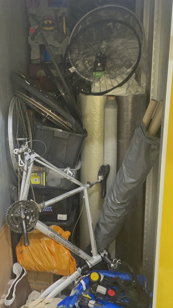 The 25 ft.² unit had a Cannondale road bike multiple spare wheels that could be a sofa other furniture E-Tyers the back of the unit bags and boxes of unknown personal items and rolls of fabric