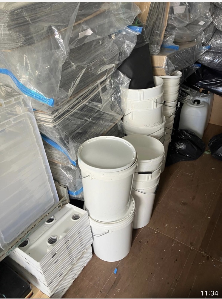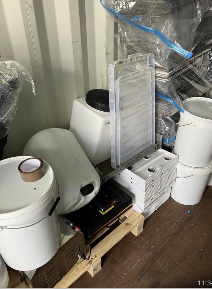 catering equipment, various boxes that say kitchen mixers, loads of bags of stuff and buckets.