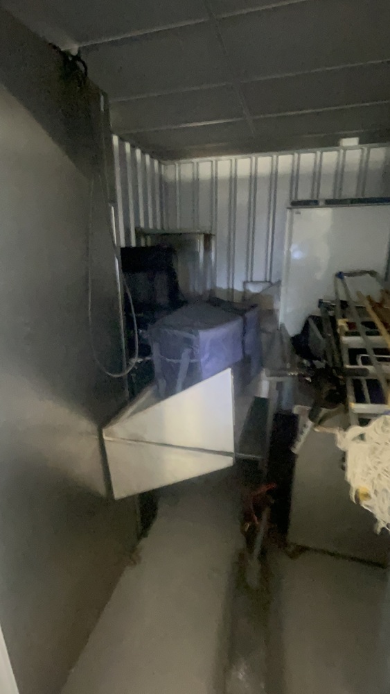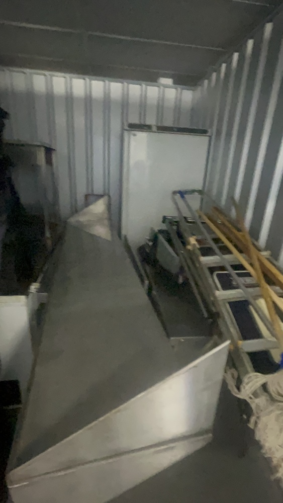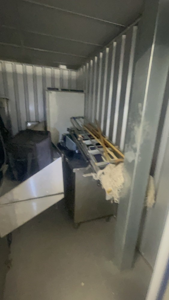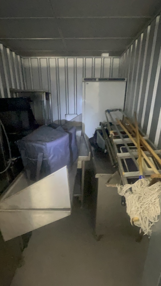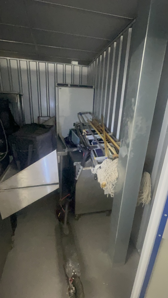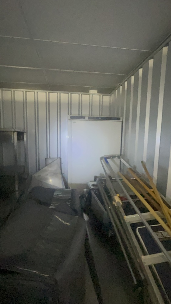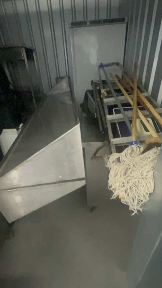 Unit has industrial fridge freezers and shop kitchens large work tops. Electric scooter, ladders, foster fridge freezer. Empty food bags.