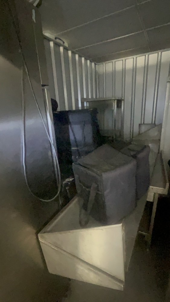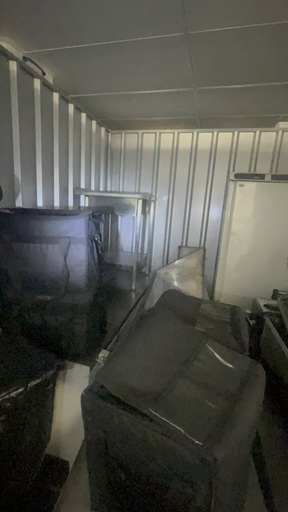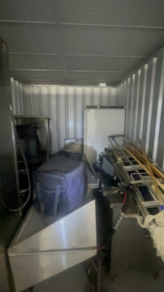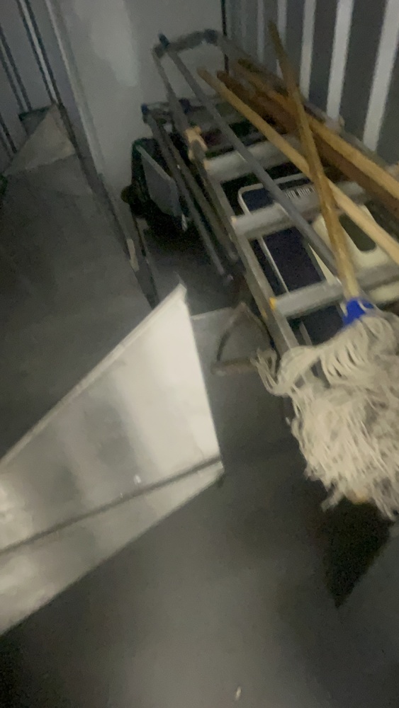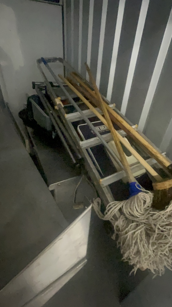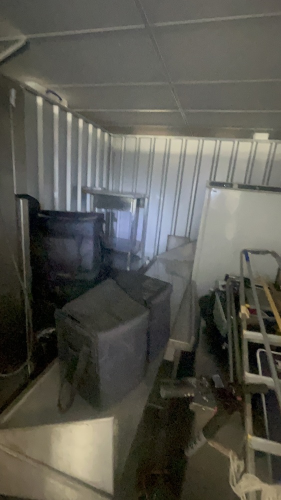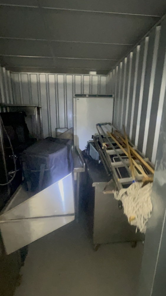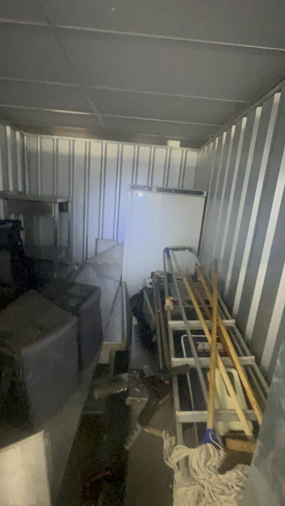 Unit has industrial fridge freezers and shop kitchens large work tops. Electric scooter, ladders, foster fridge freezer. Empty food bags.
