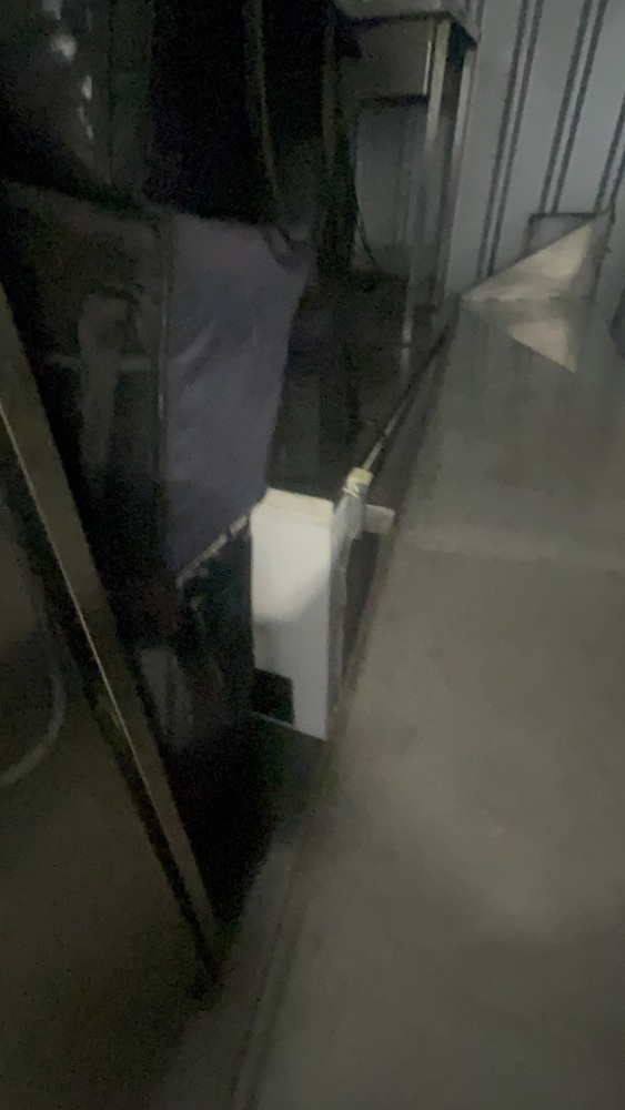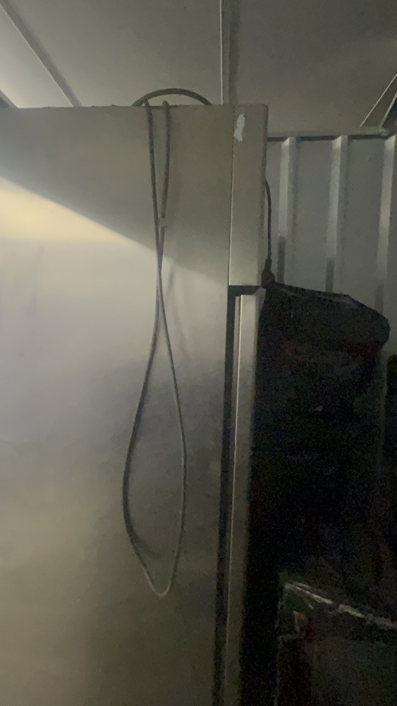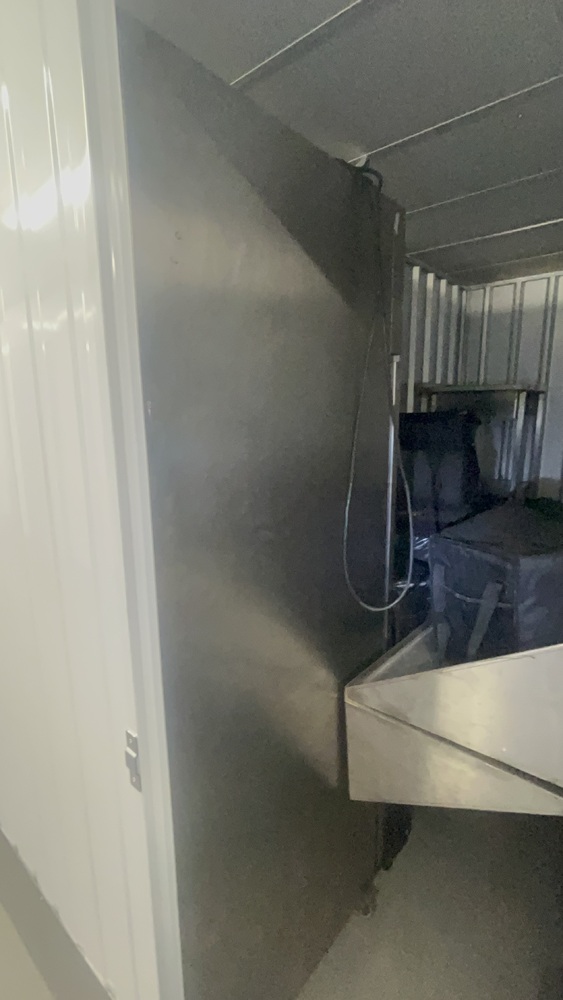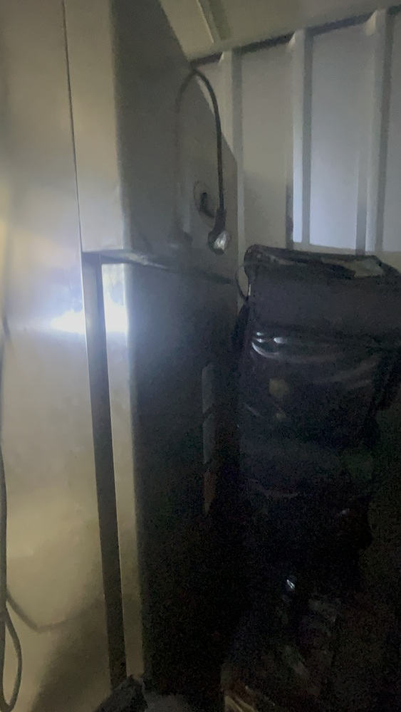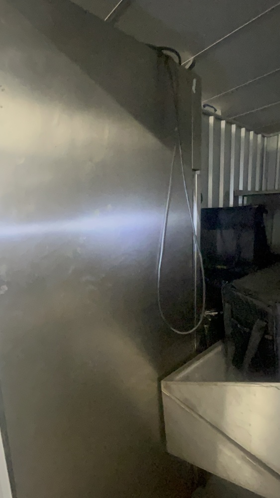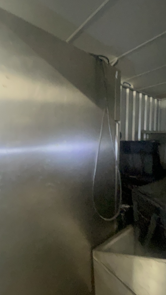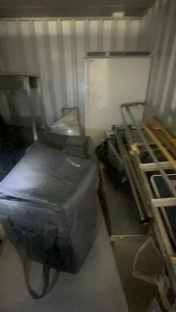 Unit has industrial fridge freezers and shop kitchens large work tops. Electric scooter, ladders, foster fridge freezer. Empty food bags.