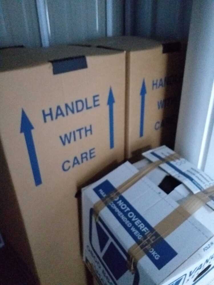 1 x box of printer/books, 4 x boxes of paperwork/office equipment, 2 x boxes of suits, 3 x boxes of clothes, 3 x boxes of household goods, 1 x clothes rack, and various other items.